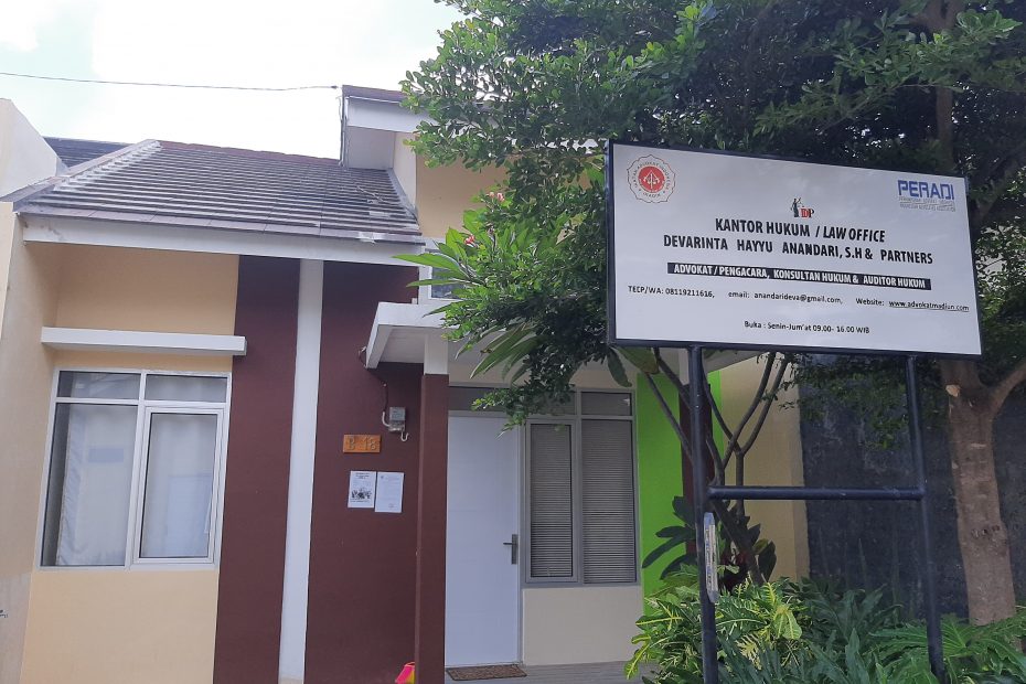 KANTOR DEVA HAYYU & PARTNERS pertama kali dibuka beralamat di D’Widji Residence Blok A18, Desa Slambur Kecamatan geger Kab. madiun. Merupakan tempat yang sangat nyaman untuk menyelesaikan dan menyelesaikan berbagai masalah hukum yang hihadapi klien. Didepan Kantor terdapat taman hijau yang sangat rindang, ayunan, prosotar dan mainan lainnya untuk tempat bermain anak-anak. Parkir Lokasi sangat mudah dan luas.